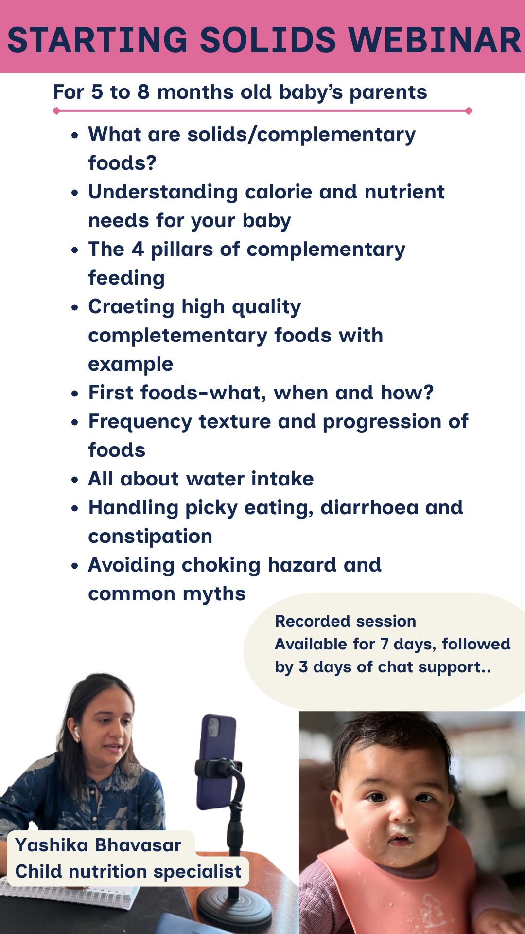 Please note: All guidance shared in the webinar will be practical in nature and focuses more on Nutritional Aspects. Mothers of 5 to 8 months old baby can take this webinar.
